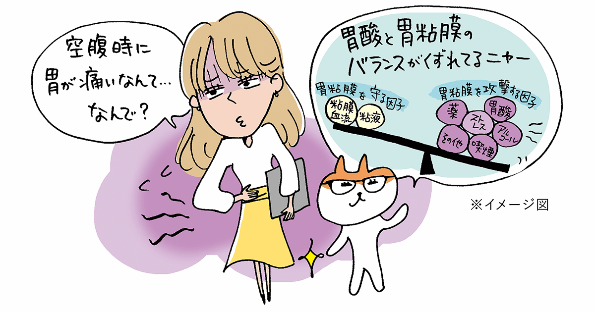 蓄積される精神的なストレスなど、原因となるイベントをきっかけに、胃の働きをコントロールしている自律神経のバランスが崩れ、さらに胃を守る力の低下を招くことで、胃酸が胃粘膜を刺激することで痛みを生じます。