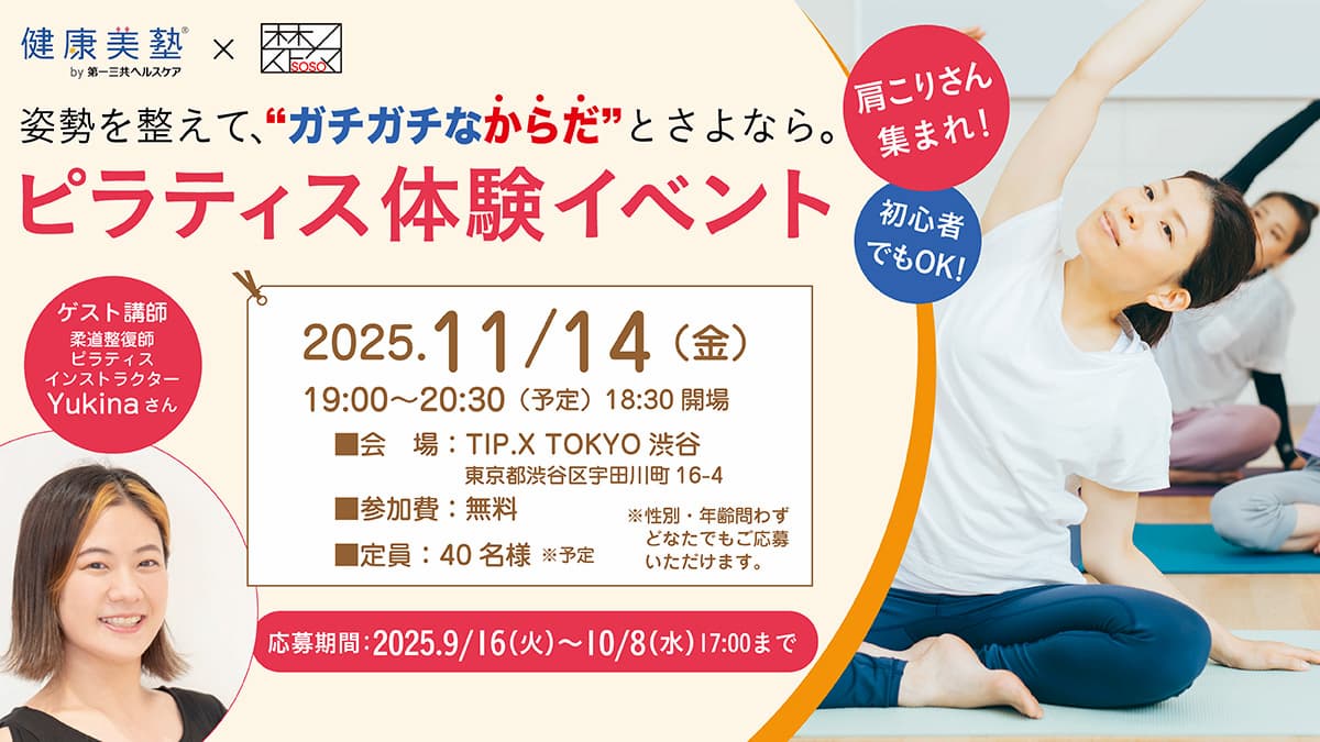 「最近、肩が重いかも…」長時間のデスクワークや日々の家事、育児等で、肩まわりの重だるさに悩んでいる方も多いのでは?そんな方に向けて、こわばった肩をゆっくりリセットするピラティス体験イベントを開催します!