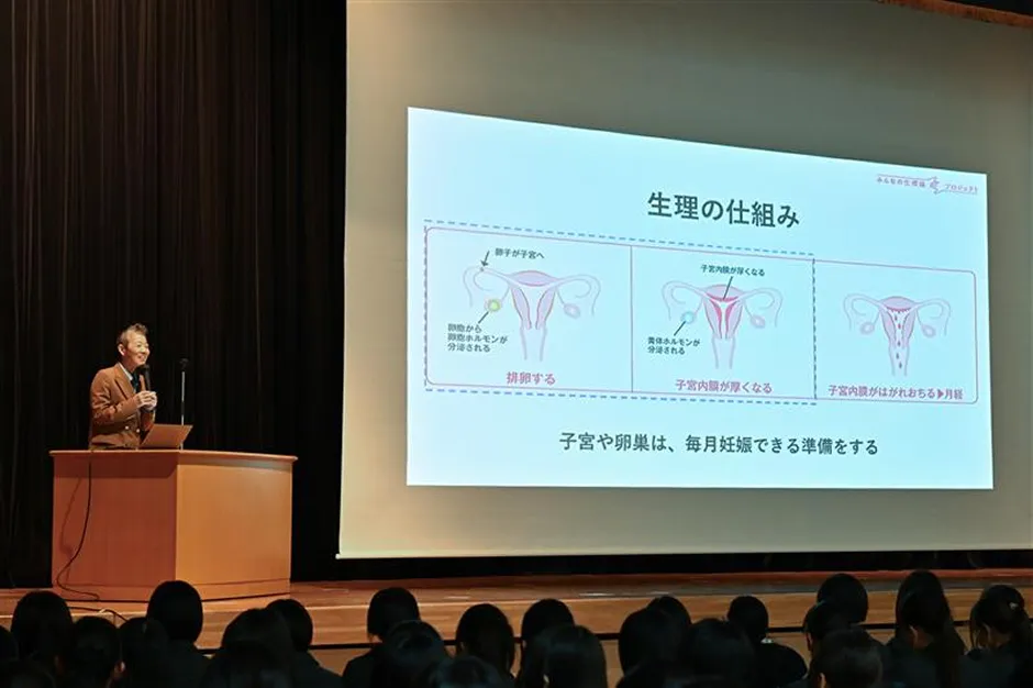続いて、産婦人科医・高尾美穂先生にご登壇いただき、生徒から事前に寄せられた「なぜ毎月血が出るの?」「生理痛はなぜ起こるの?」「生理痛ってどんな痛み?」などの疑問にお答えいただきました。