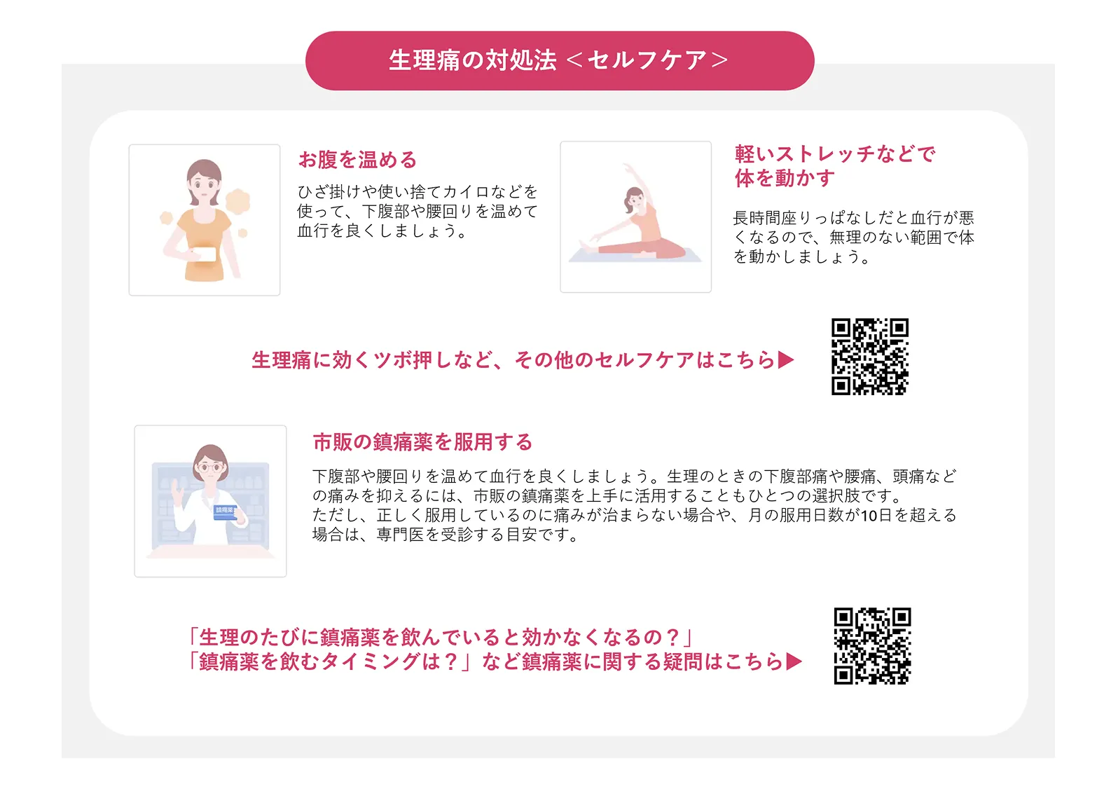 本セミナーを通じて、養護教諭の皆さまから「生徒・保護者向けの保健だよりや校内掲示物などに活用できるデータがあると、情報発信に活用しやすい」との声をいただき、「みんなの生理痛プロジェクト」が制作した情報を一覧にまとめました。画像の形式でダウンロードいただけますので、学校での指導にぜひお役立てください。