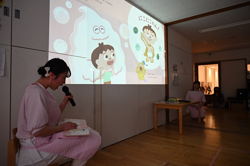 おねえさんの朗読をじっと聴いていた園児も、ふわふわの泡をつくってからだをくるくると洗う場面になると、すかさず大きな動きで応えます。泡でからだを洗う楽しさやさっぱりときれいになる爽快感が、園児の皆さんにも伝わった様子です。