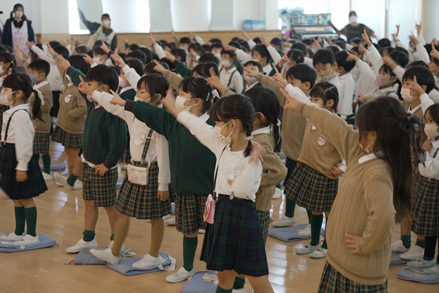 読み聞かせのあとは、音楽のリズムに合わせてからだを動かすダンスタイム。「やさしくくるくる洗っちゃおう!」というおねえさんの誘いに乗って園児たちは、からだを “やさしく、くるくる”洗っていく動きにトライ。ダンスの最後は、絵本でおなじみ、人差し指を天に高く突き出す「にこにこのん!」ポーズを全員で決めて、ノリノリの締めくくりに。