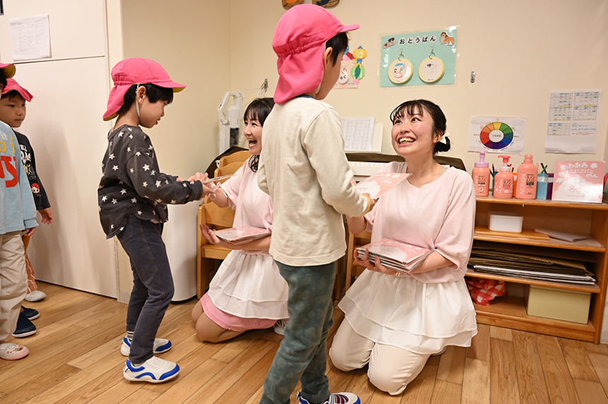 会の終了後は、2人のおねえさんが、タッチをしながら園児の皆さまを一人ずつお見送り。さらに、今日の内容をご家庭でも実践できるよう、絵本『あわあわ もこもこ にこにこ のん』をプレゼントしました。